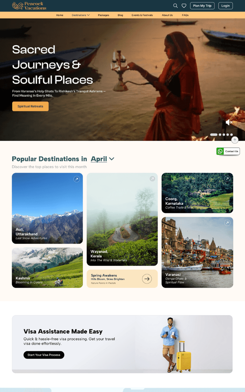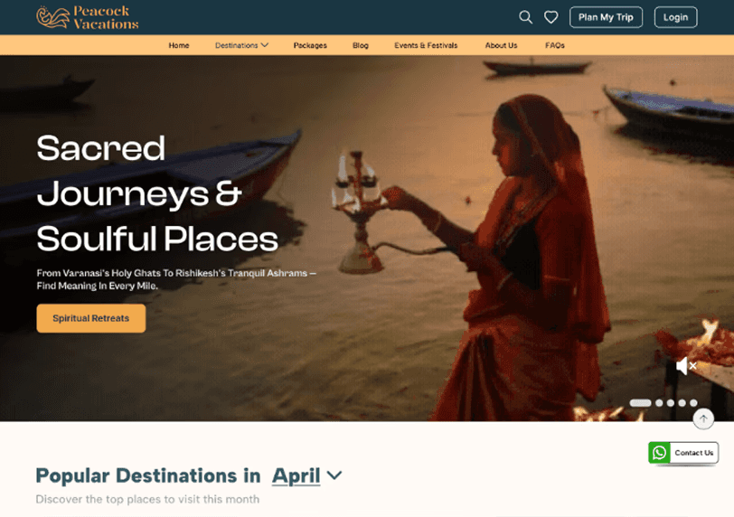 A modern travel website highlighting destinations, curated tour packages, and cultural storytelling for foreign travelers visiting India.